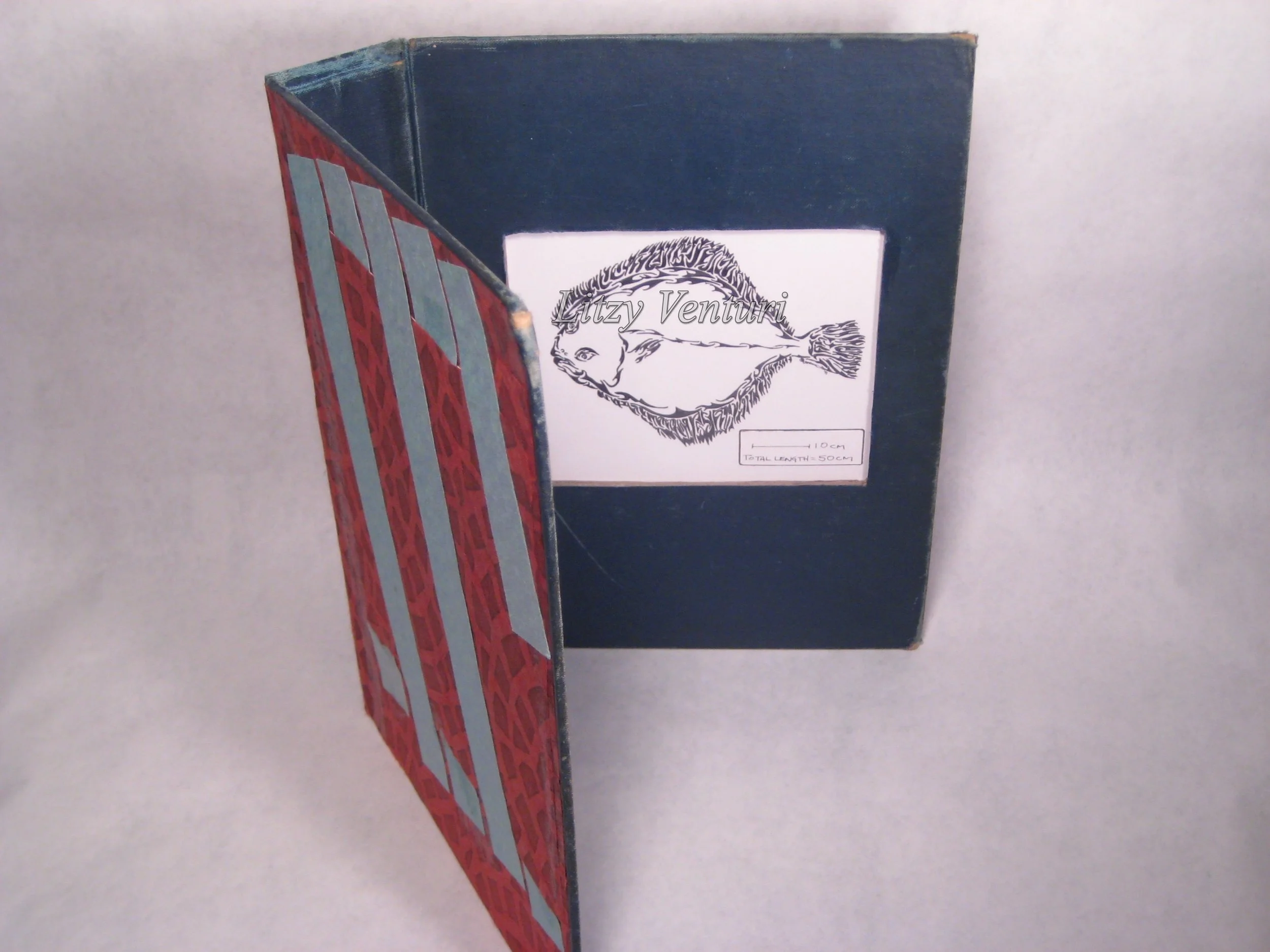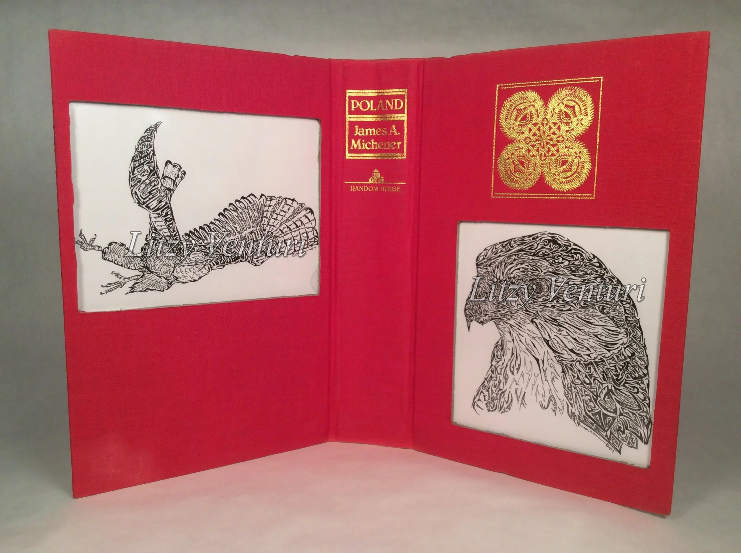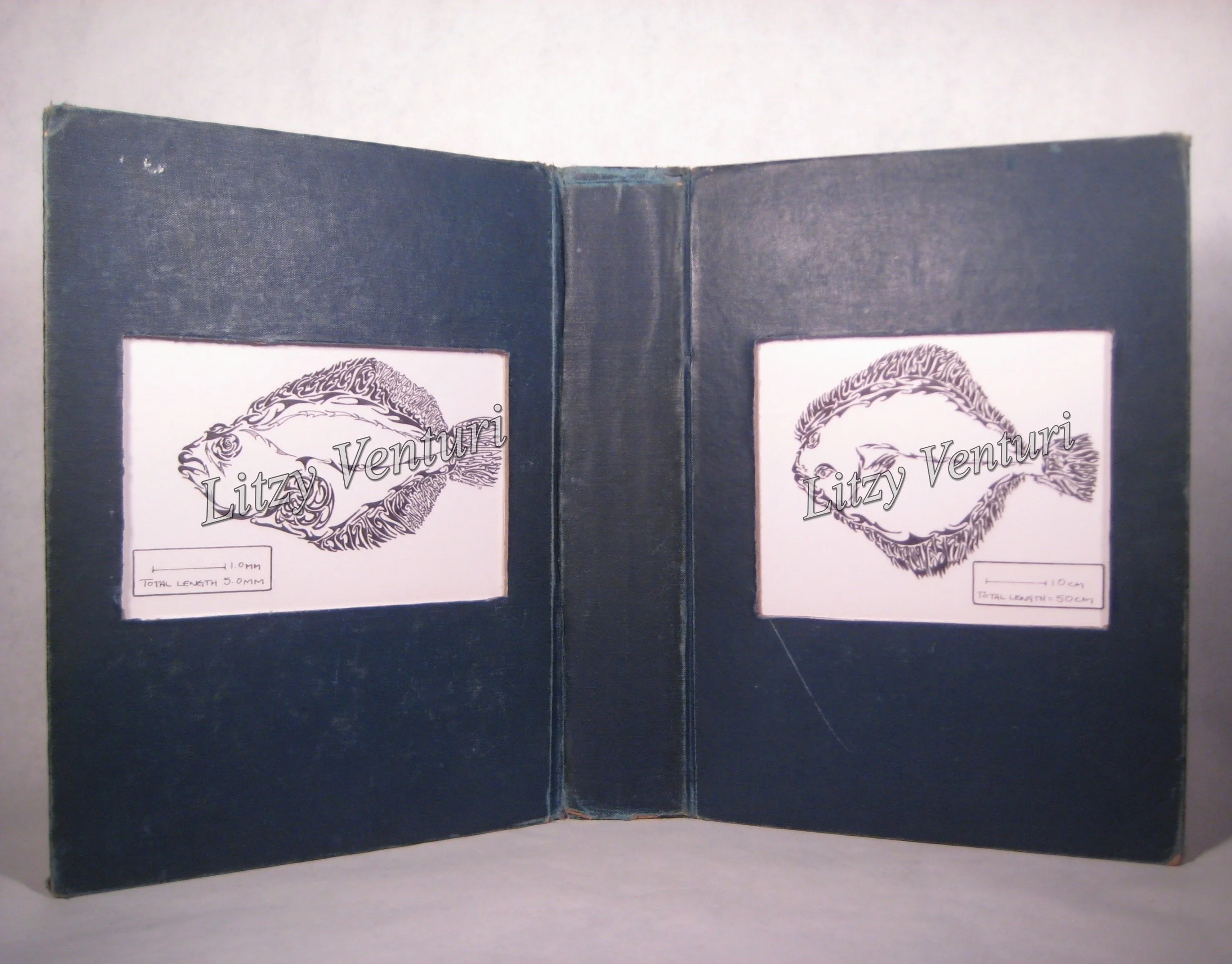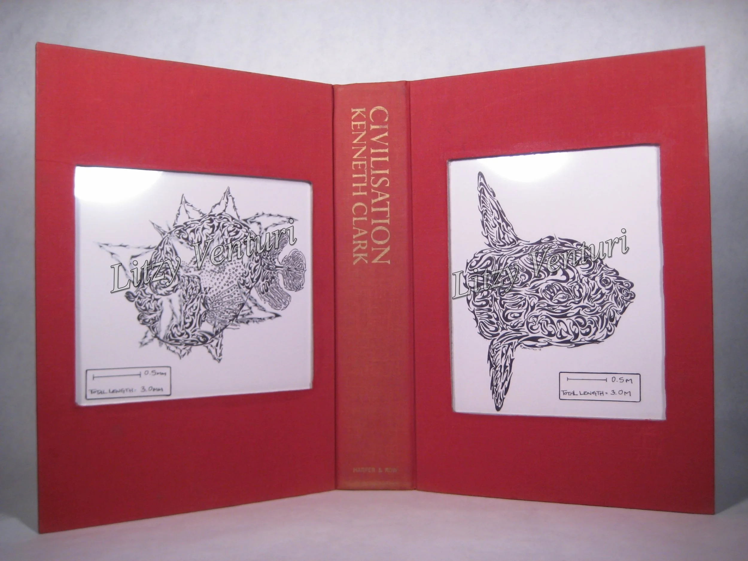 These original ink drawings are mounted in cut-out book covers, transforming them into frames. The cut-out windows are covered with clear mylar to protect the original drawing. The frame is backed with colorful paper.
